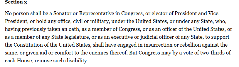 Most of you are aware by now of an article by Evan A. Davis and David M. Schulte over on The Hill that suggests our Congress doesn’t need to accept Trump’s electoral win. The argument is a 14th Amendment one: Section 3 stipulates that insurrectionists cannot hold Federal office unless and until they are successful in a 2/3rds of Congress votes to “remove such disability.”